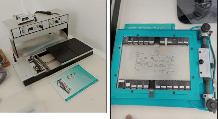 Stroj je v dobrém technickém stavu, po předchozí dohodě možnost odzkoušení. poloautomatický stroj pro šetrné umisťování komponentů s příslušenstvím pro uchopení a kazetami .Výkon osazování: 400–700 SMD součástek za hodinu Rozměry zařízení: 700 × 680 × 340 mm Maximální velikost desky plošných spojů: 550 × 310 mm Max. plocha osazování: cca 425 × 310 mm Tloušťka desky plošných spojů: 0,5 mm až cca 4 mm Podporované součástky: od čipu 0201 do cca 70 × 70 mm Navigace pomocí 4 LED diod pro osazování součástek – zajištění správného umístění Možnost použití CAD dat a offline přípravy projektu